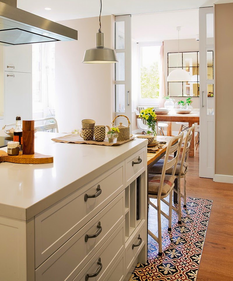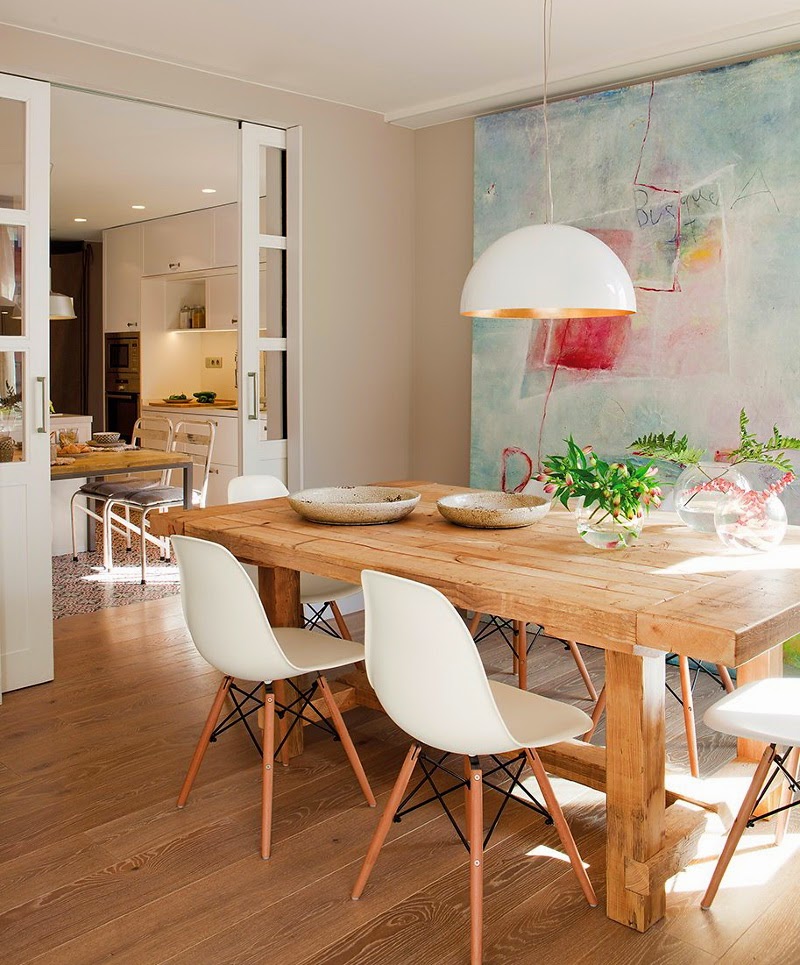 existe uma infinidade de casas perfeitas, que podiam fazer parte dos meus sonhos em tantos aspetos. este apartamento tem conforto e bom gosto escritos em cada divisão, sem descurar o requinte de alguns detalhes que pontuam a decoração. o chão da cozinha é um pormenor delicioso, mas o que me cativou absolutamente foi a zona de refeições, com aquela mesa de madeira com um ar robusto e rústico, contrastando com a leveza das cadeiras e a delicadeza da tela em fundo. a lareira, que a divide a zona de estar, faz ter vontade de passar as tardes de inverno em casa, com os pés quentes e um livro no colo. uma sala inteligente e bonita, onde os livros e as molduras são o centro das atenções. o quarto de casal, luminoso, simples, arrebatador. e nem a varanda lá falta. magnífico.