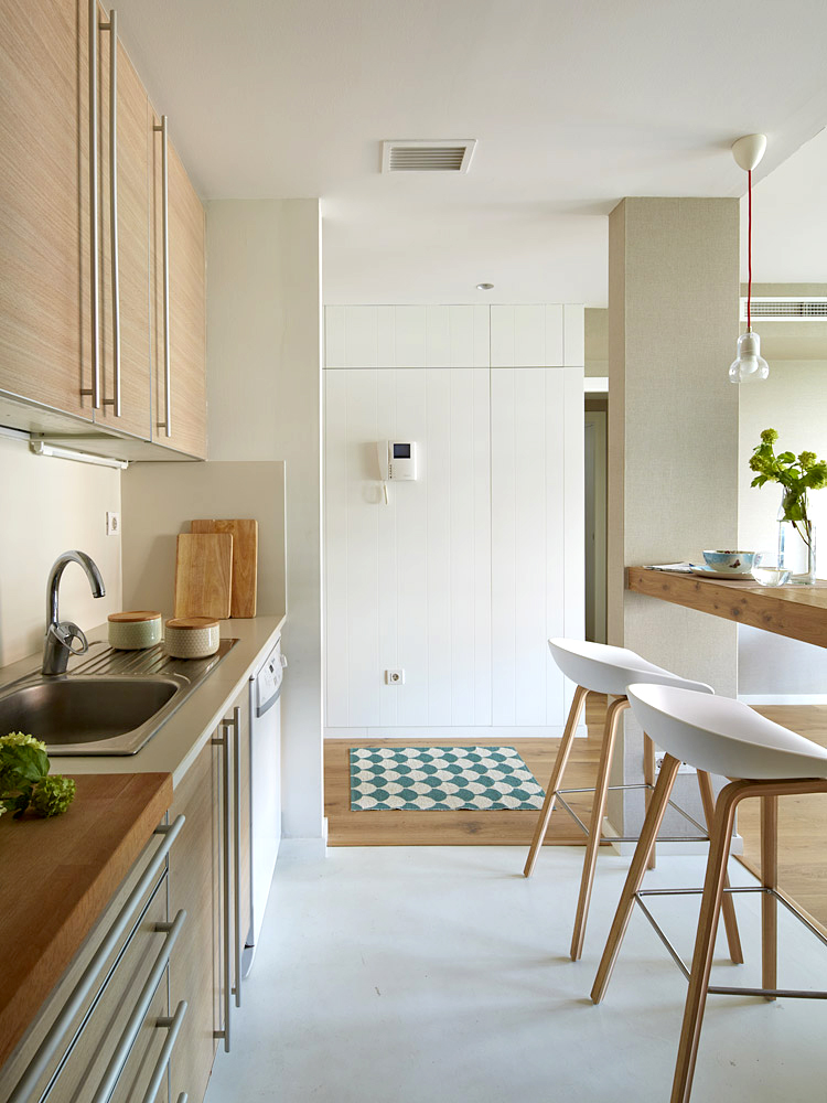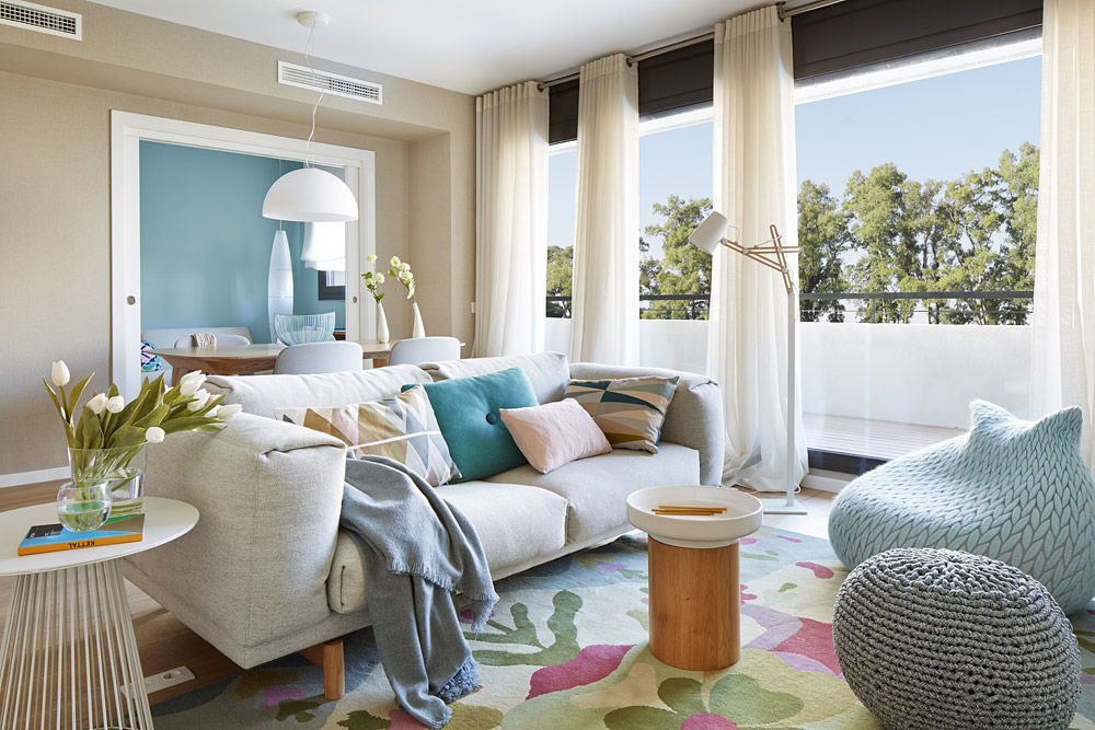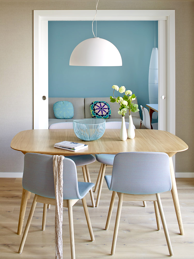 um apartamento marcadamente feminino, cuja cor base é o azul. alguns apontamentos, como a mesa e as cadeiras da zona de refeições, dão um toque retro. tapetes com padrões conferem um ambiente acolhedor. madeira clara e muito branco completam esta paleta, que inspira tranquilidade.