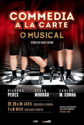 até amanhã, no Coliseu dos Recreios, em Lisboa (a 7 e a 8 de maio, no Porto), sobem ao palco os três da Commedia a la Carte, desta vez em versão musical. partindo da história de amor de um casal do público, haverá toda uma hora e meia de improviso, com música, dança e, claro, muitas gargalhadas. eu já vi e adorei.